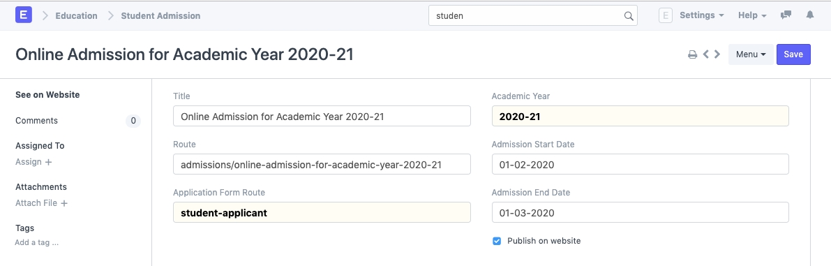 Publish on Website: Check this box when the content of the portal is ready and the Admission Process can be kickstarted on the website.