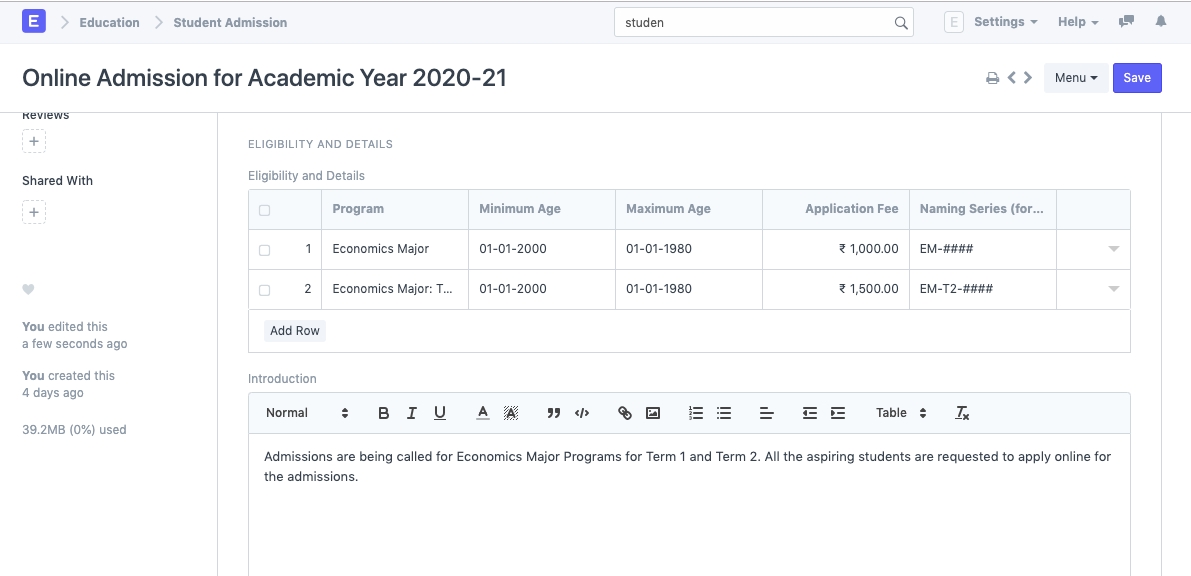Naming Series: Here you can define the Naming series based which the forms of the Admission Seekers will be named ond ordered.