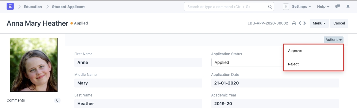 Once the student applies, the status of the application by default is "Applied". You can either "Approve" or "Reject" the form.