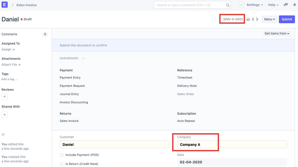 Once this is done, click on Update. Now, go to Sales Invoice and create one. Select the Company and the Naming Series will be updated automatically based on the company's abbreviation.