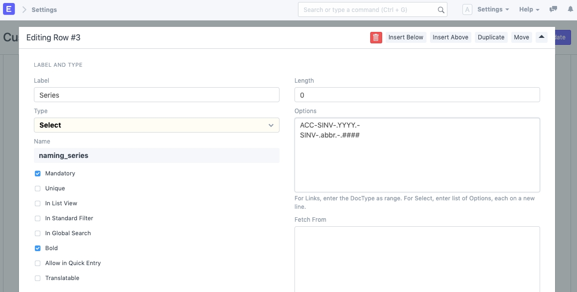 3) Now, in the Customize Form itself, go to the Naming Series row and expand it. In the Options box, add another entry in new line (taking Sales Invoice as example) SINV-.abbr.-.####