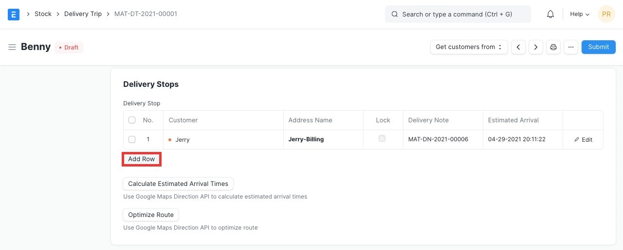 Add customers for delivery stops, the address will be fetched if already set. Customers can also be fetched by clicking on 'Get customers from > Delivery Note'. Additional Delivery Stops can be added by clicking on the Add Row button before submitting:
