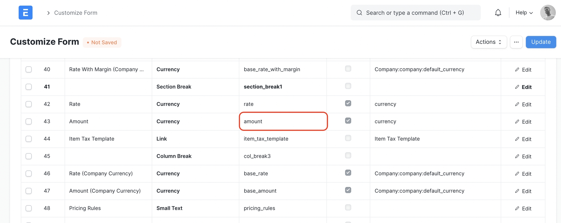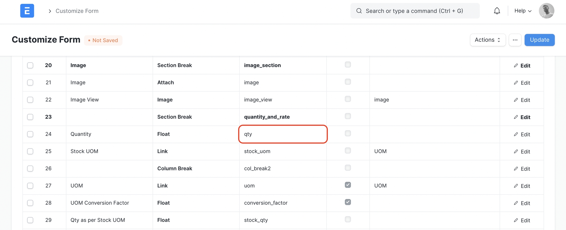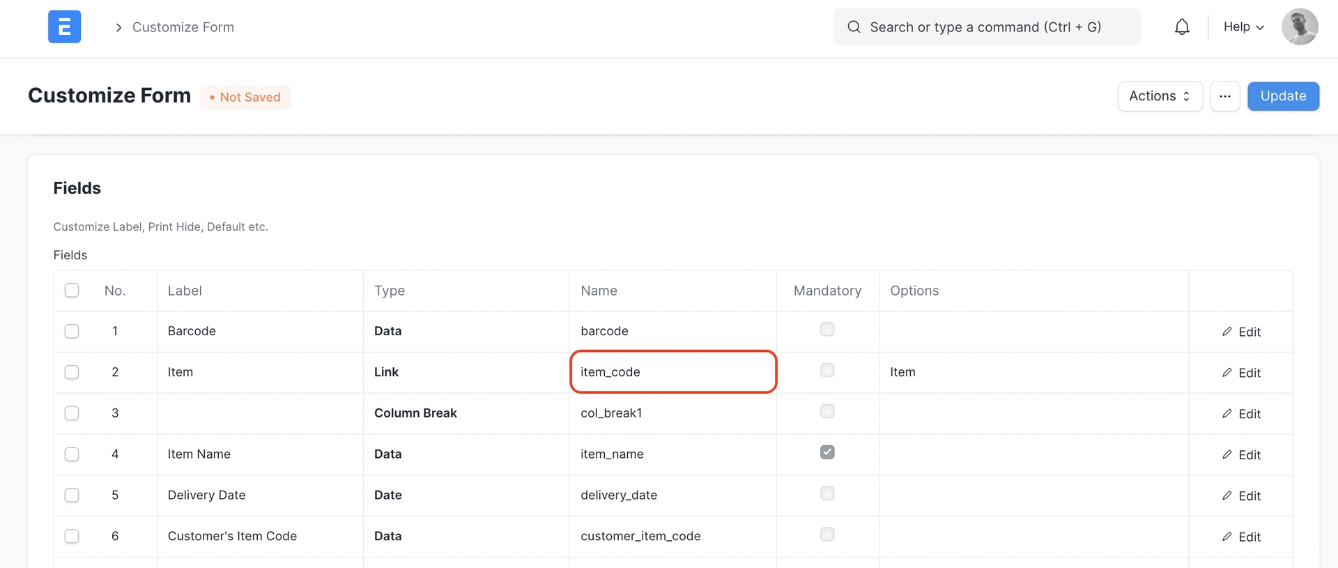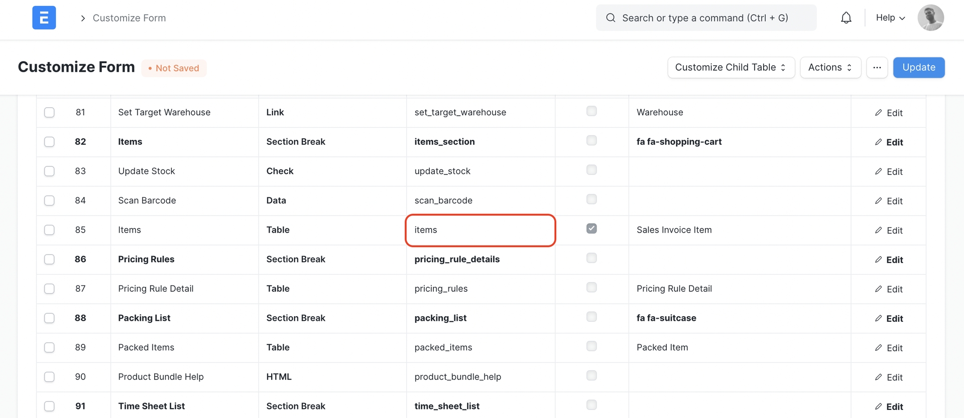 We will also require the variable names of all the fields inside the child table which need to be referenced. This can be obtained from the 'Customize Form' section of the corresponding child table as shown below