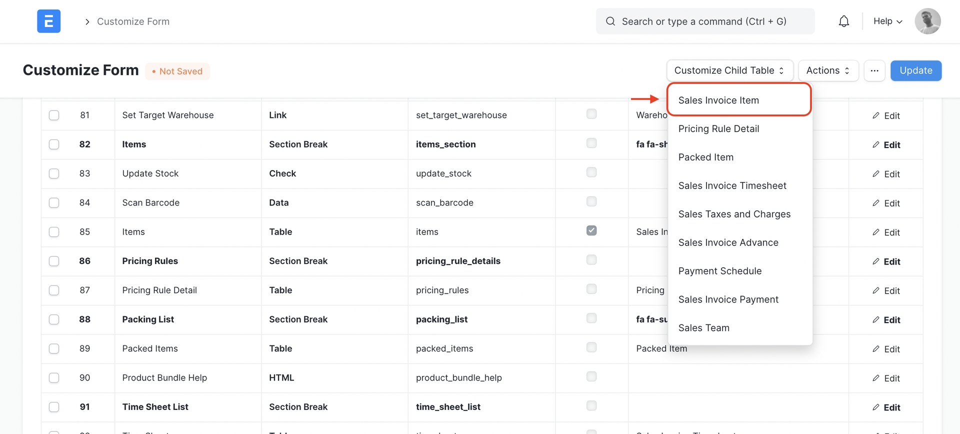 We would require the variable name of the child table on the corresponding DocType. This can be viewed from the 'Customize Form' section for the required DocType. The same is illustrated below