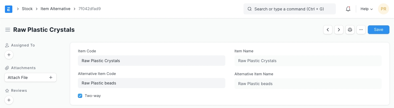 This can also be done by clicking the plus sign next to 'Item Alternative' from the Item master dashboard. You can enable Two-Way replacement between an Item and their alternative item if both can be used as an alternative to each other.