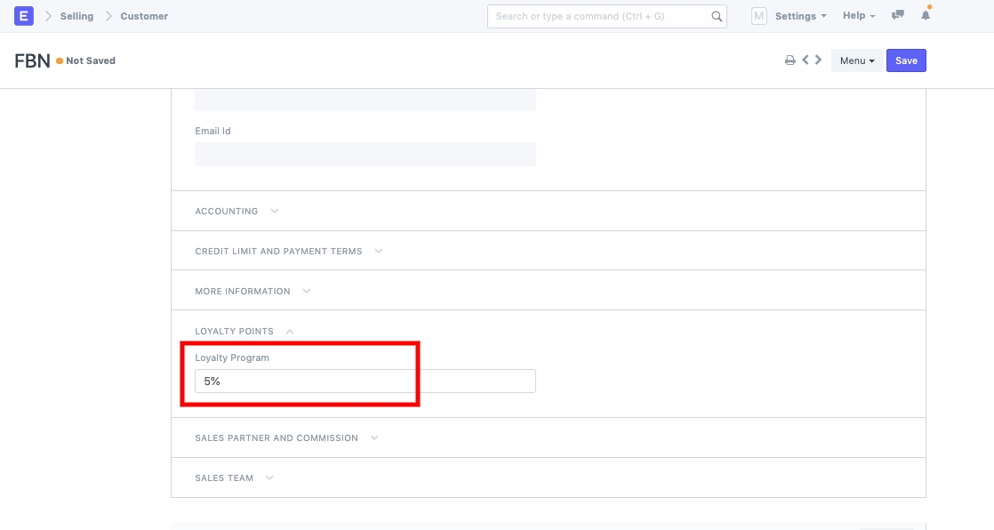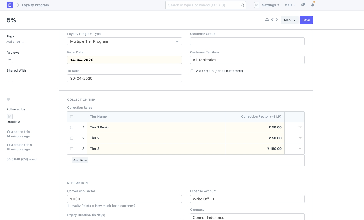 Create a Loyalty program in the doctype: You can set Single Tier or a Multiple Tier Program based on the slabs existing in the amount of Purchase that is done in Howinibs.
