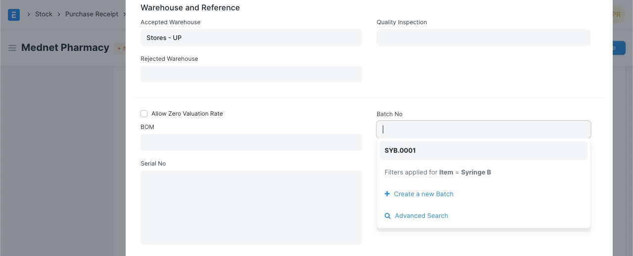 When creating Purchase Receipt, you should create new Batch, or select one of the existing Batch master. One Batch can be associated with one Batch Item.