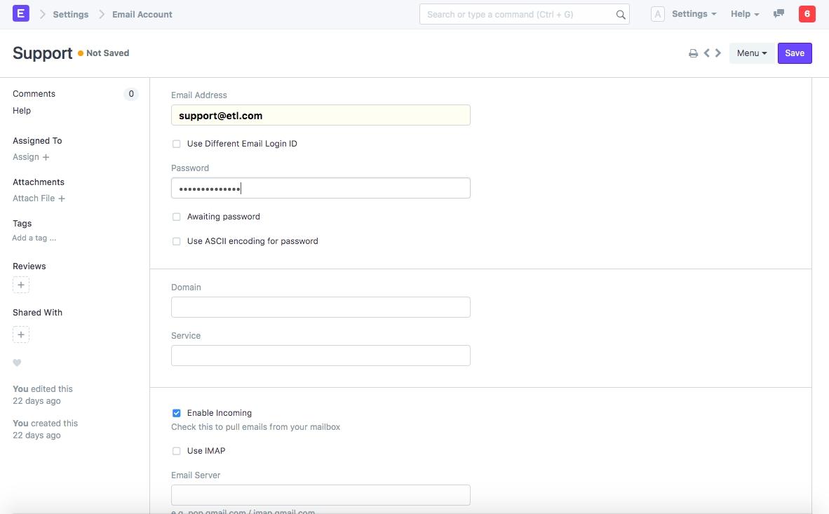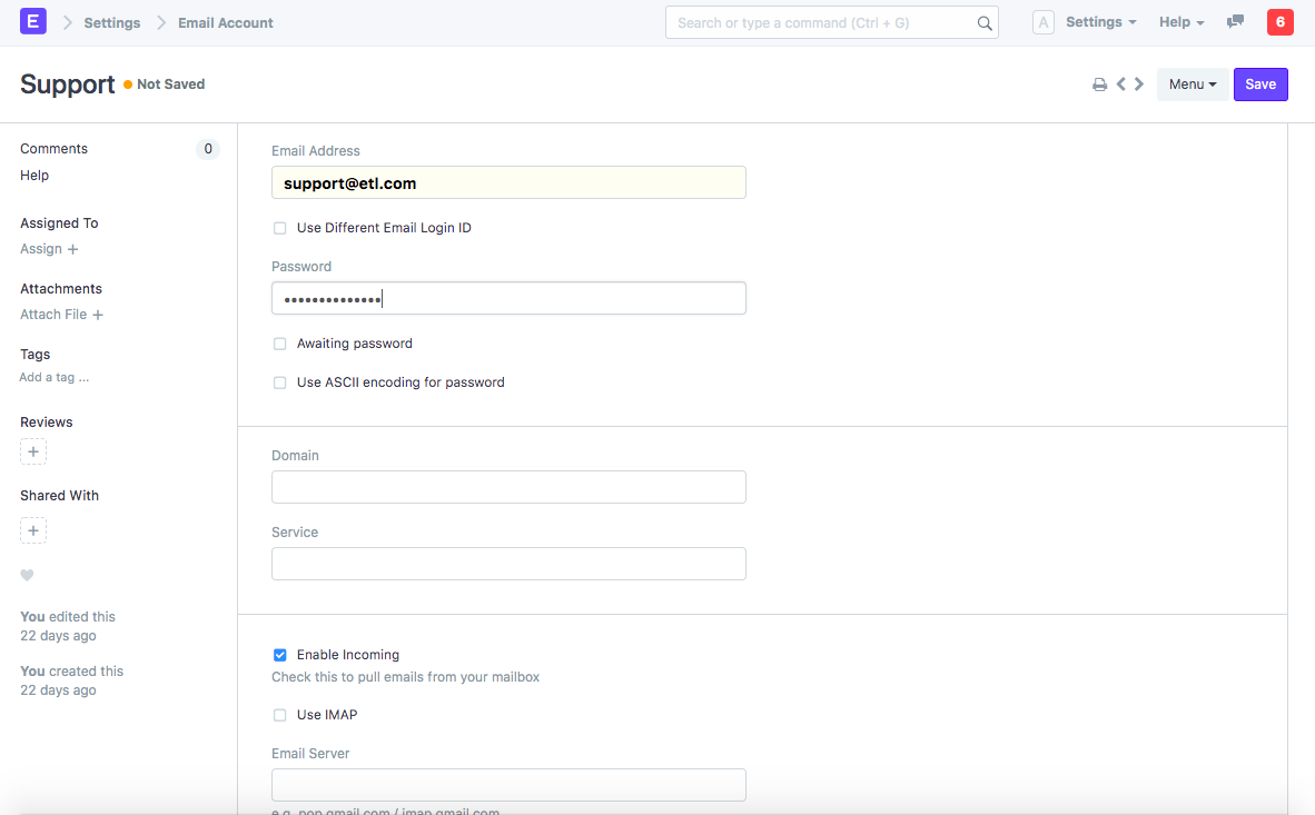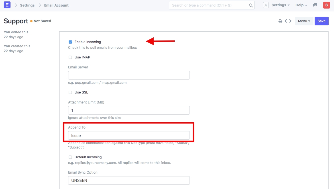 First, we need to setup an email account that appends the incoming emails received there into the "Issue" DocType of ERPNext.1) Create an Email Account:You need to update email domain and setup your support email address in ERPNext's Email Account. To learn about email setup, please check out this link