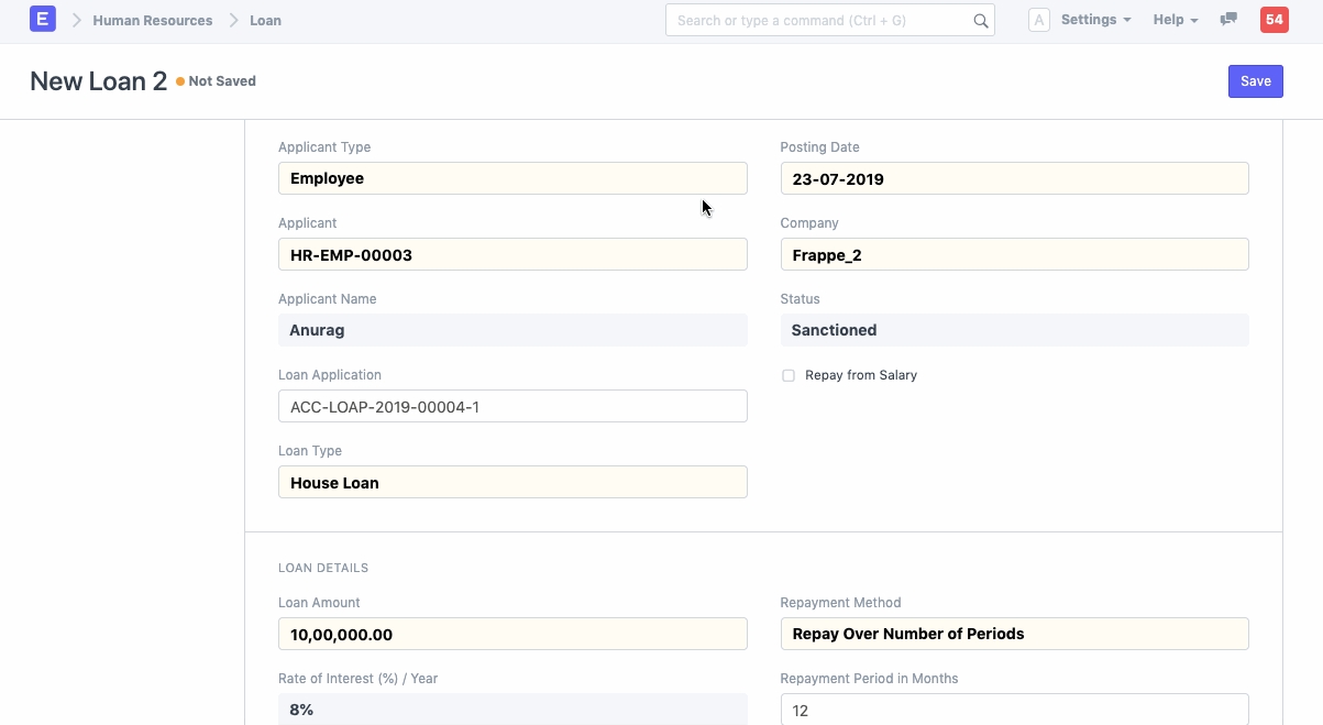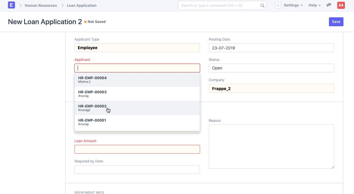 2. Once this is done, Employee can apply for a loan. To apply for a Loan, fill Applicant Type, Applicant, Loan Type, Loan Amount and Repayment Method.