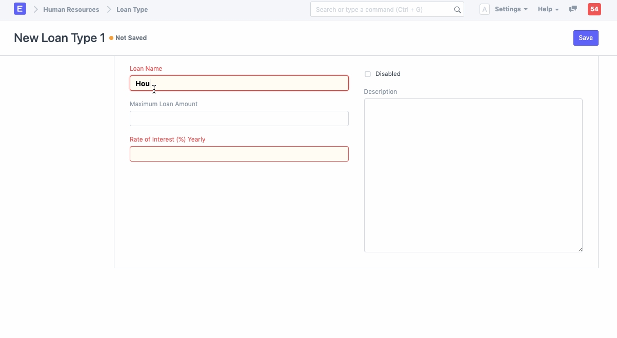The Loan Management System in ERPNext Involves several steps to follow: 1. For this, first you need to create the loan type where you need to fill the mandatory fields i.e. Loan Name, Rate of interest (%) Yearly. Here you can also define the Maximum Loan Amount and description if any.