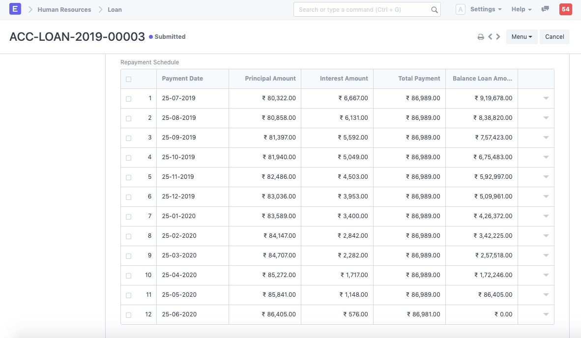 After submitting the document, it creates Loan Repayment Schedule as shown below: