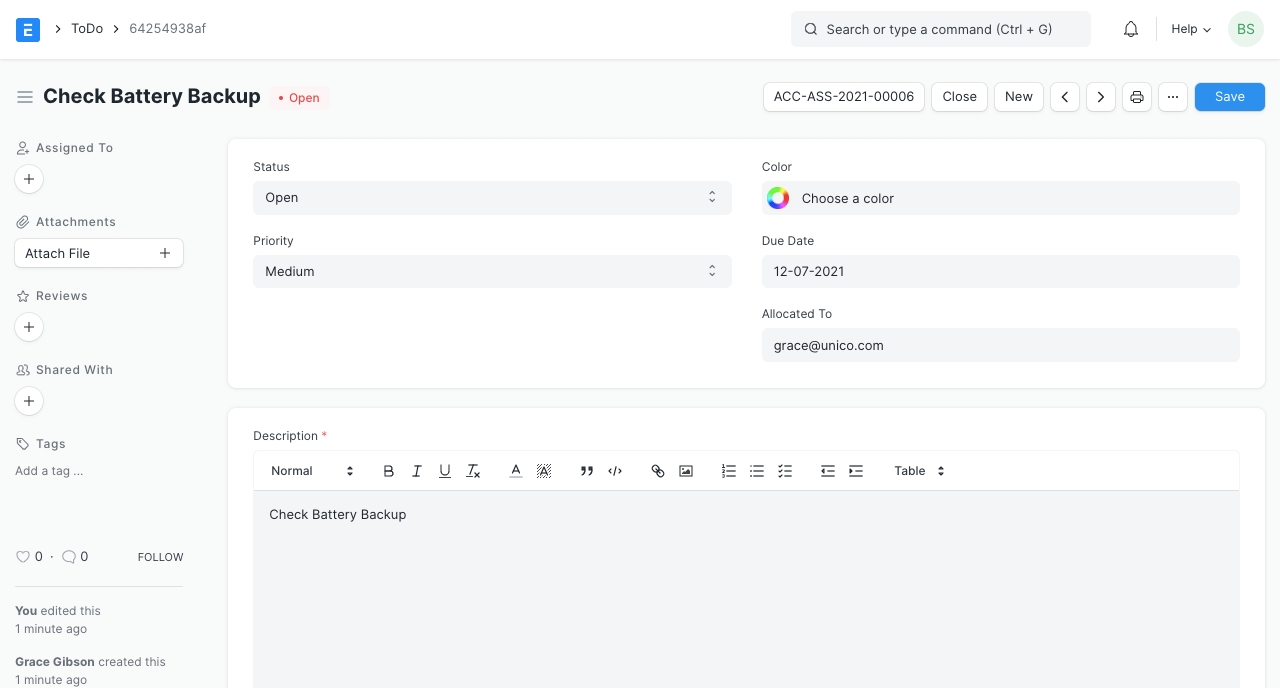 For each asset, create an Asset Maintenance record listing all the associated maintenance tasks, maintenance type (Preventive Maintenance or Calibration), periodicity, assign to and start and end date of maintenance. Based on start date and periodicity the next due date is auto-calculated and a ToDo is created for the Assignee.