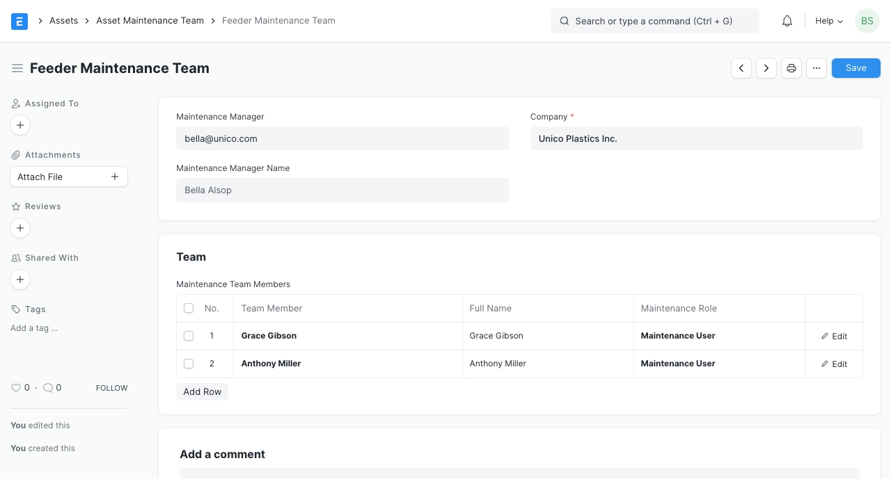 In the Maintenance Team Members table, add the team members and select their maintenance roles.