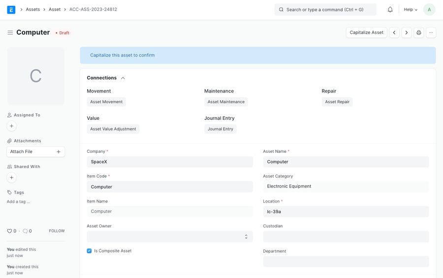 In ERPNext, the Asset record is the heart of asset management module. All the transactions related to an Asset like purchasing, depreciation, maintenance, movement, scrapping, sales will be recorded against the Asset record.