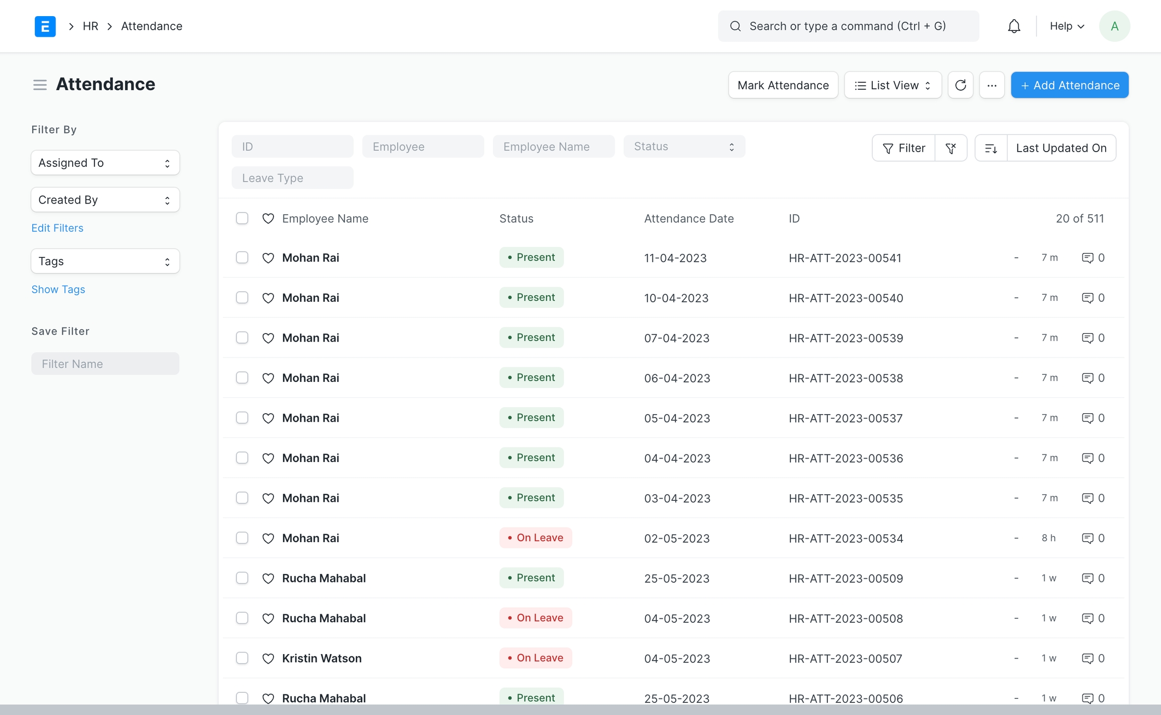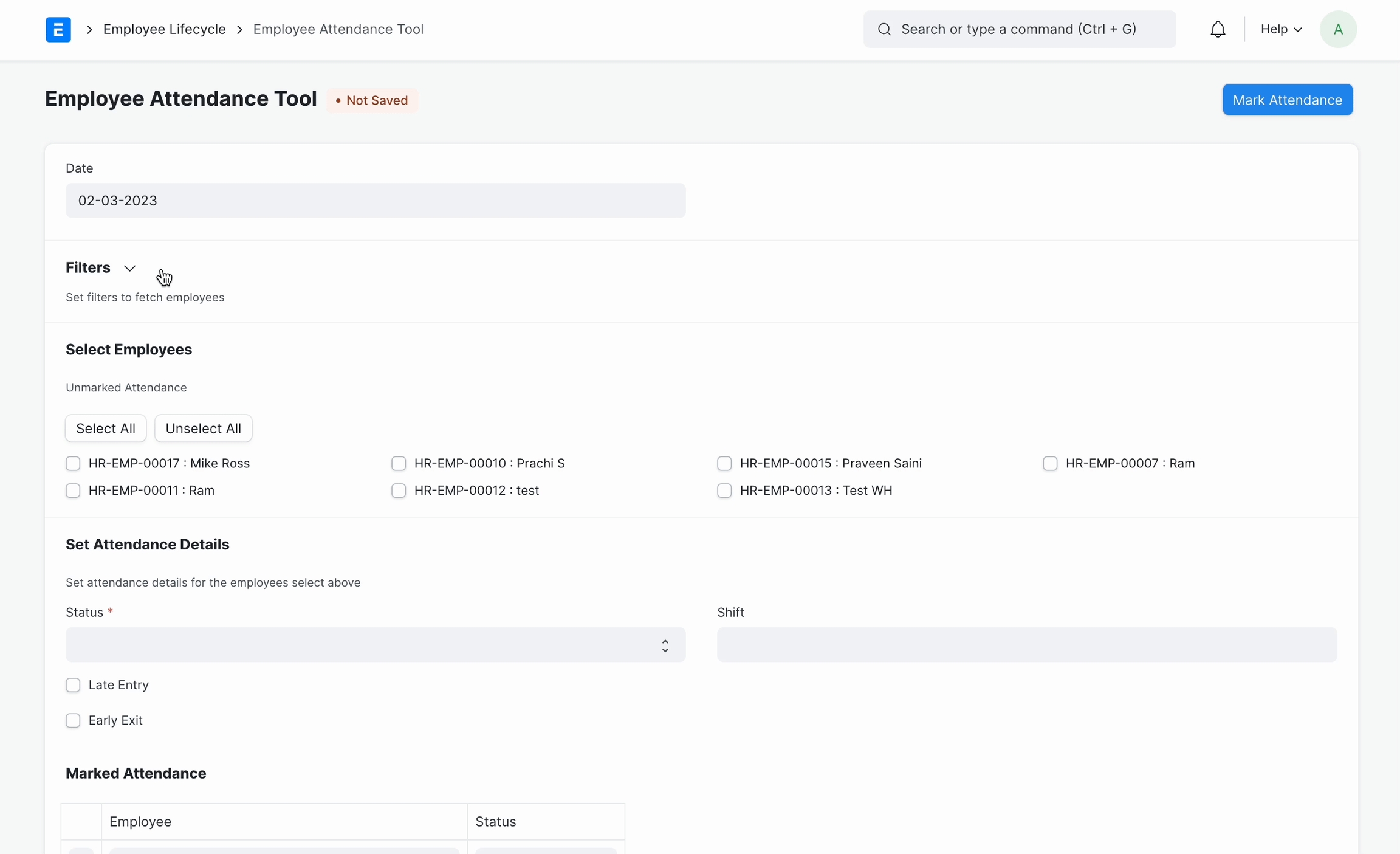 Employee Attendance Tool allows you to mark the attendance of multiple employees for a particular date.