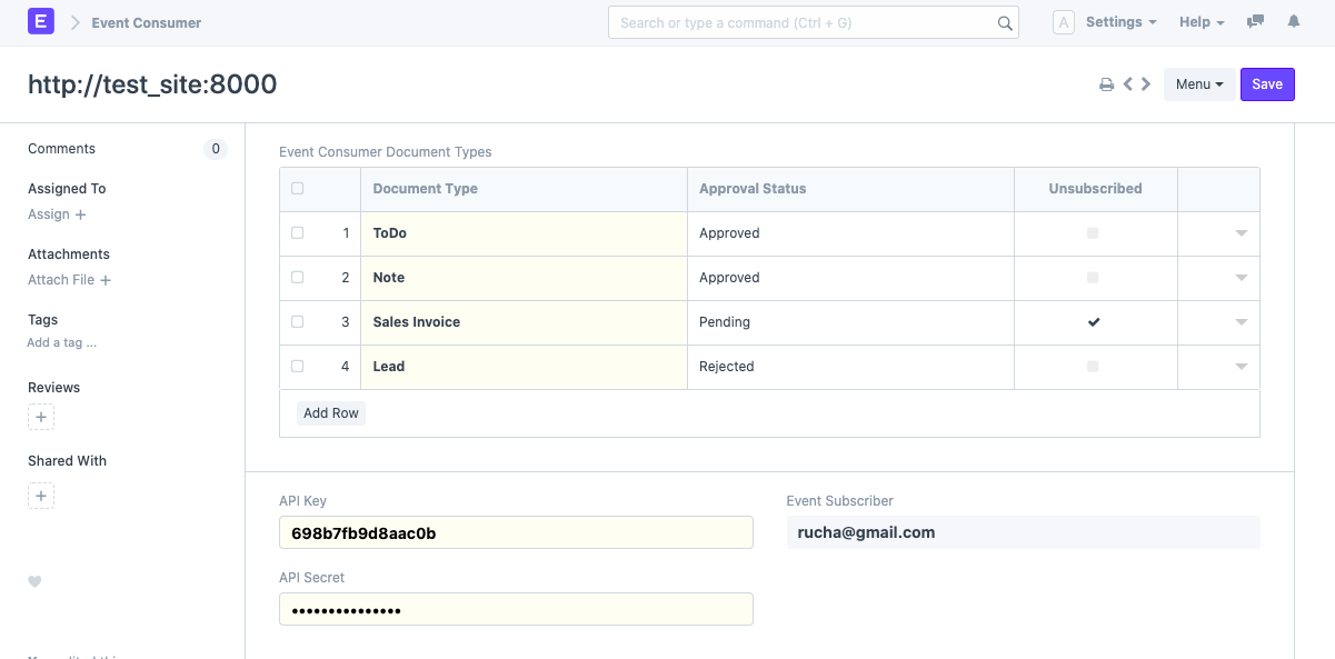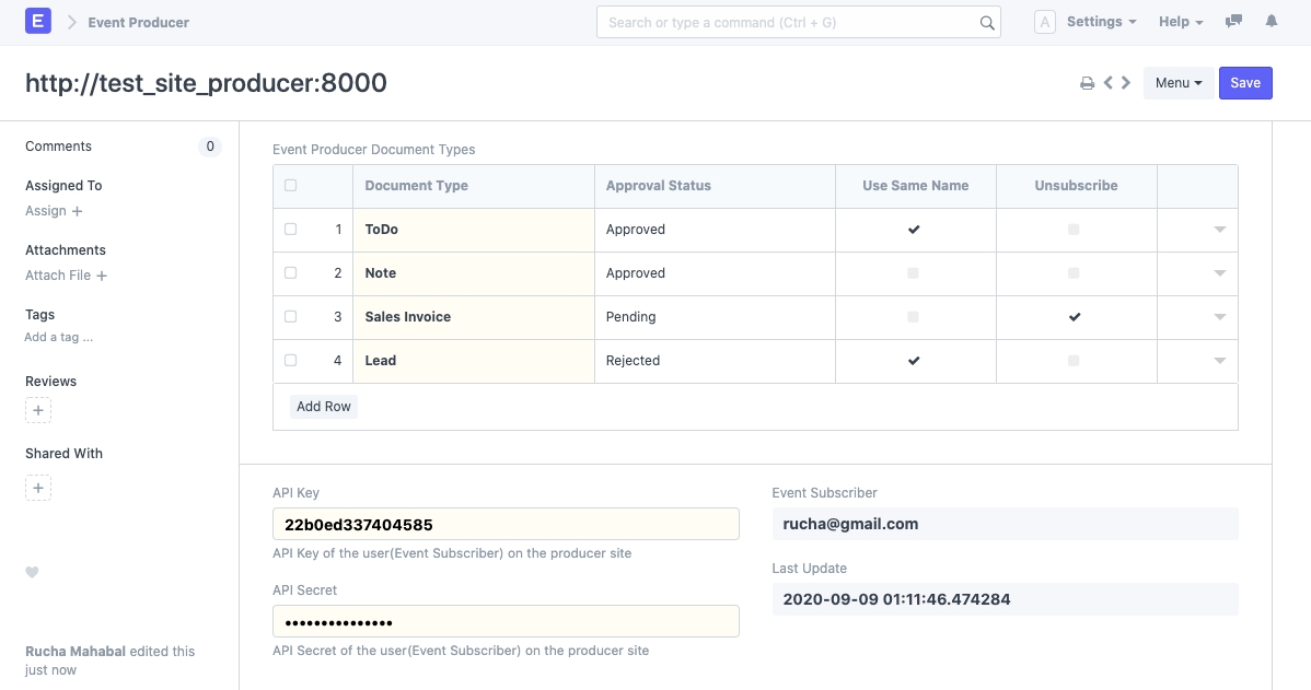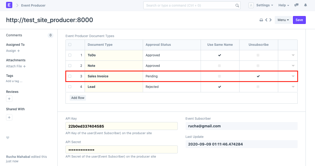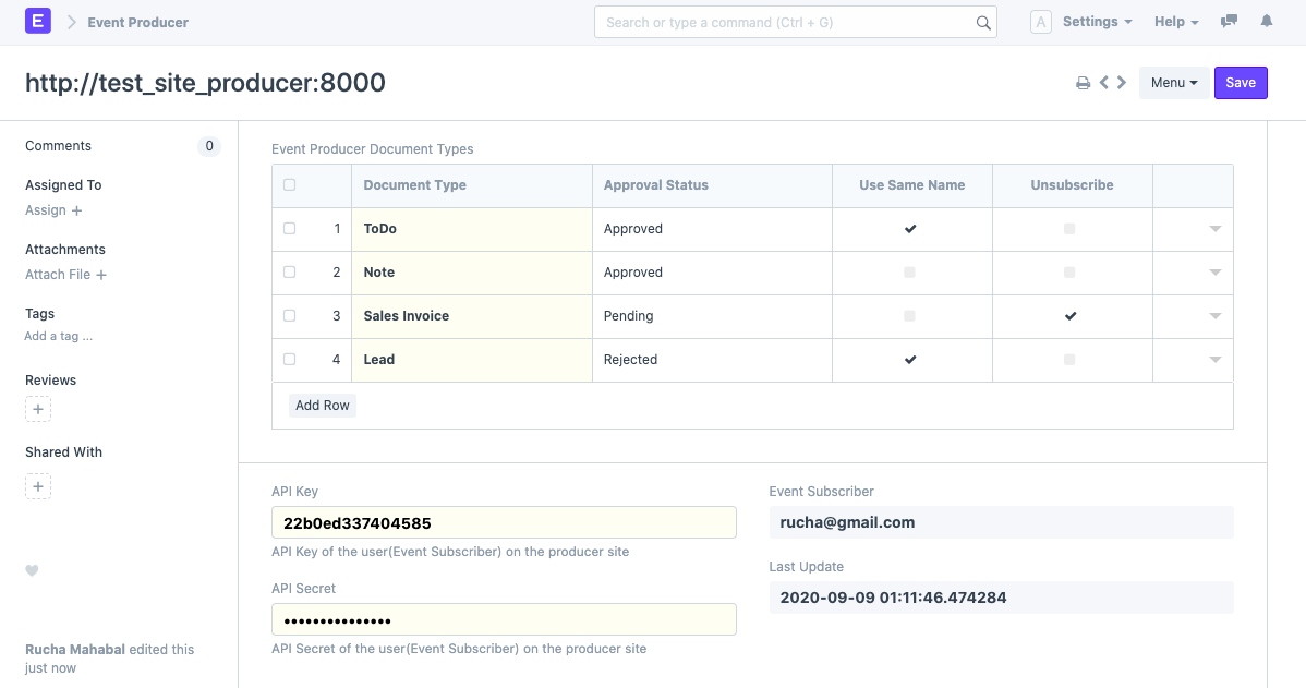 After saving, an Event Consumer is created on the producer site (http://testsiteproducer:8000). The keys of the user on the consumer site are automatically copied to the Event Consumer document on the producer site in this process.