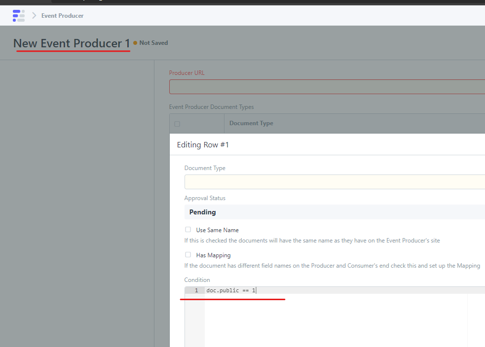 After the Event Producer has been created, an Event Consumer automatically gets created on the producer site. By default, all the Subscribed Document Types have the status as 'Pending'. In order to enable the Event Consumer to consume the documents of these Document Types, their Status needs to be updated to 'Approved'.