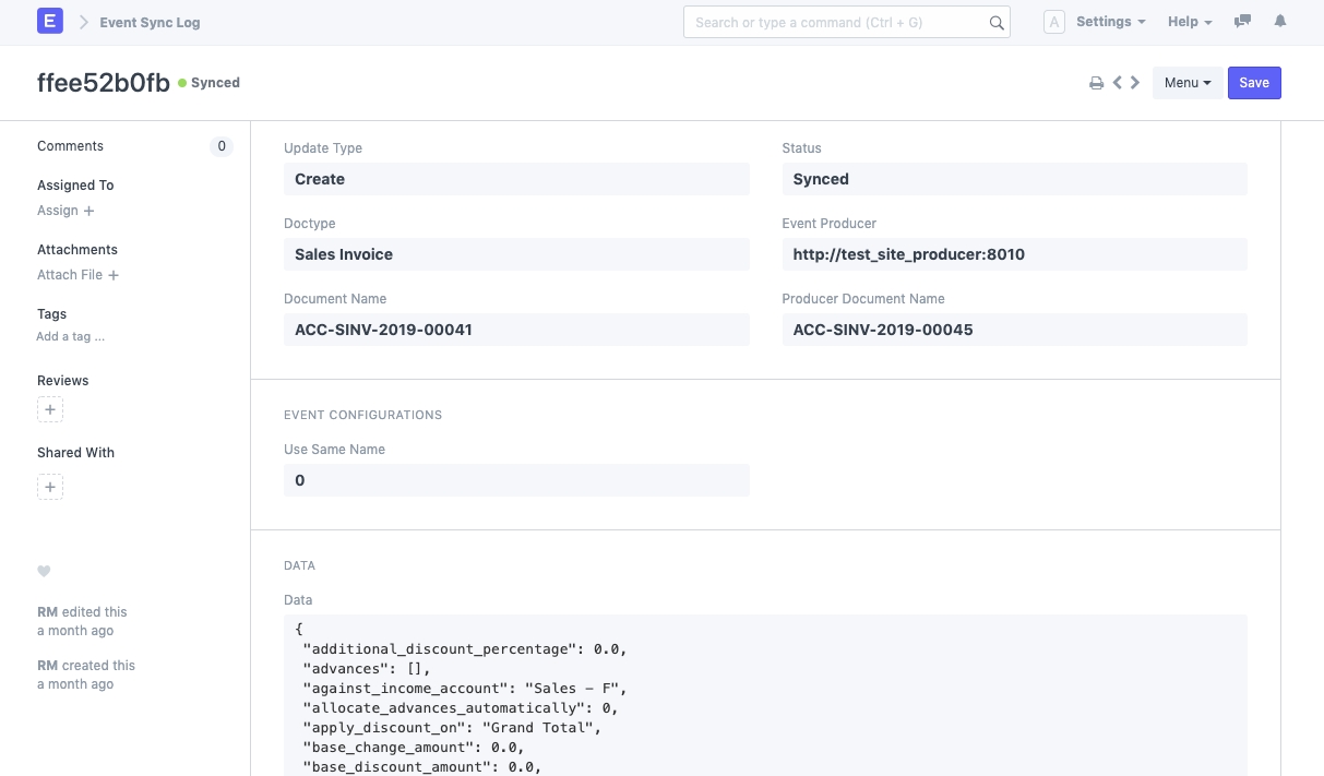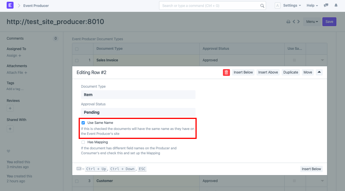 Note: For Document Types that have naming series, it is advised to keep the 'Use Same Name' checkbox unchecked, to prevent naming conflicts. If this is unchecked, the Documents are created by following the naming conventions on the current site and the 'Remote Site Name' and 'Remote Document Name' custom fields are set in the synced document to store the Event Producer site URL and the document name on the remote site respectively.