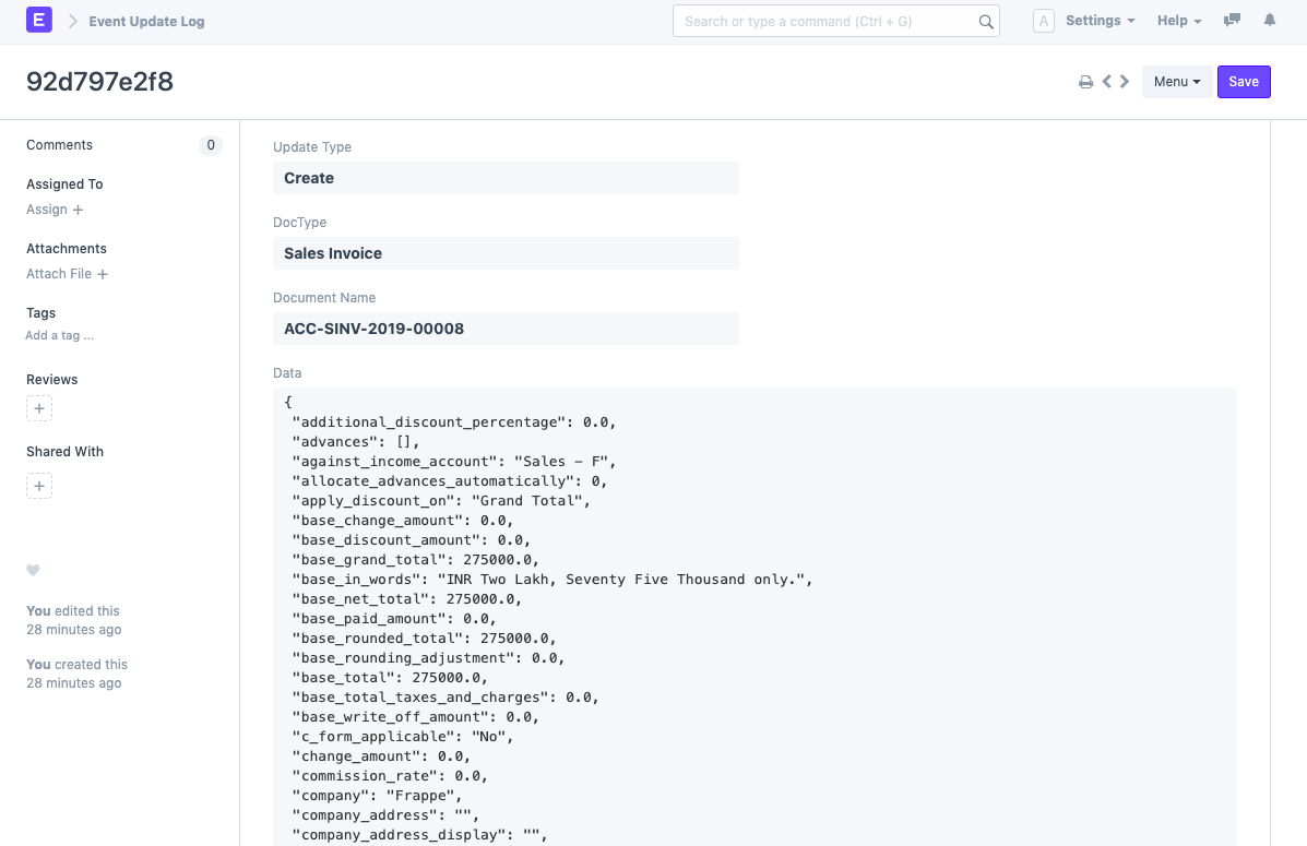 For 'Update' type the Update Type, Document Type, Document Name and the updated data (difference between the previous state and current state of the document) is logged.