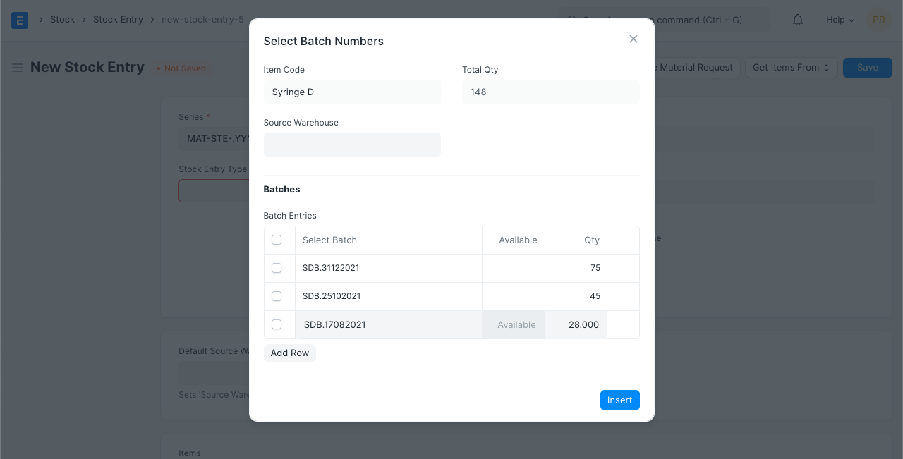 > Tip: While entering an Item Code in an Items table, if the table requires inventory details, then depending on whether the entered item is batched or serialized, you can enter serial or batch numbers right away in a pop-up dialog.
