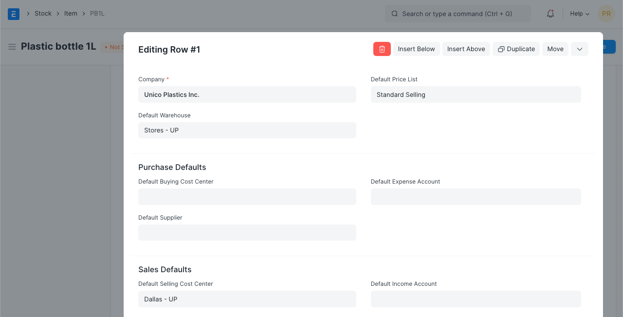 In this section, you can define Company-wide transaction-related defaults for this Item.