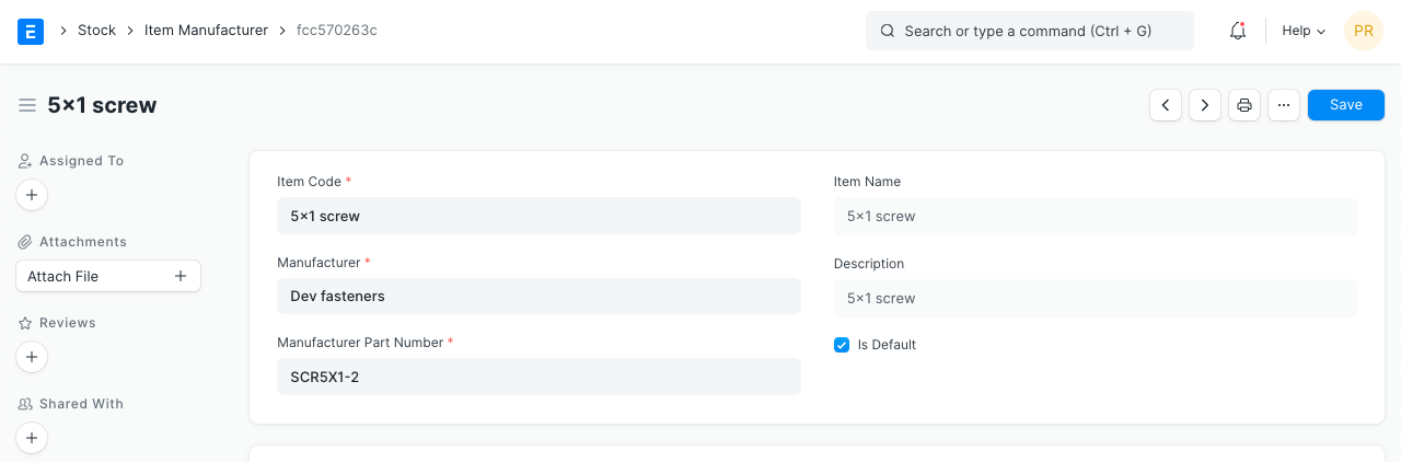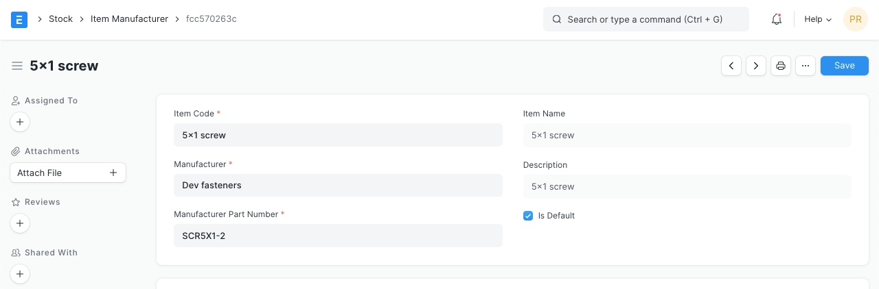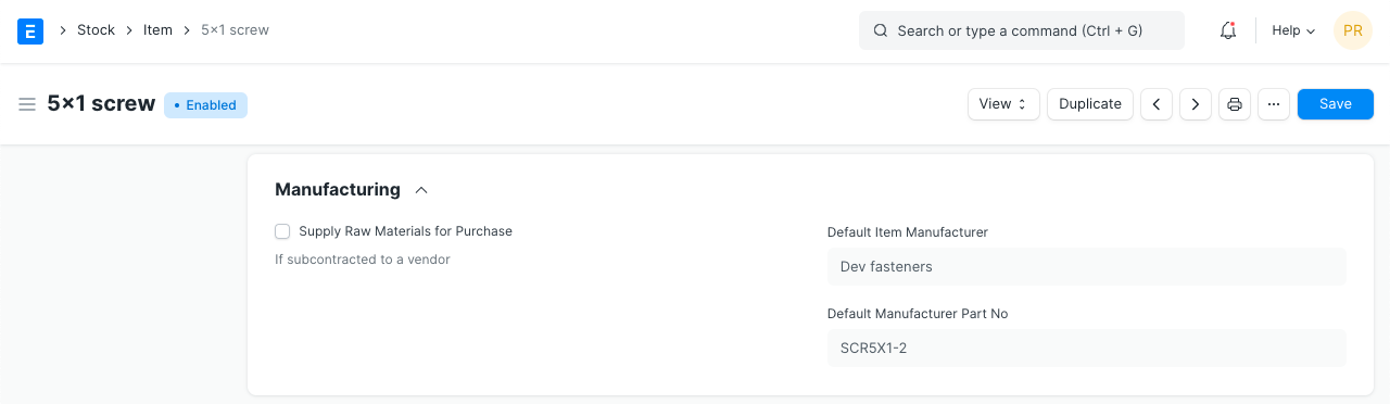 Item Manufacturing The manufacturer details appear after you've created an 'Item Manufacturer' from the dashboard and selected that record as default. Here, add details for: