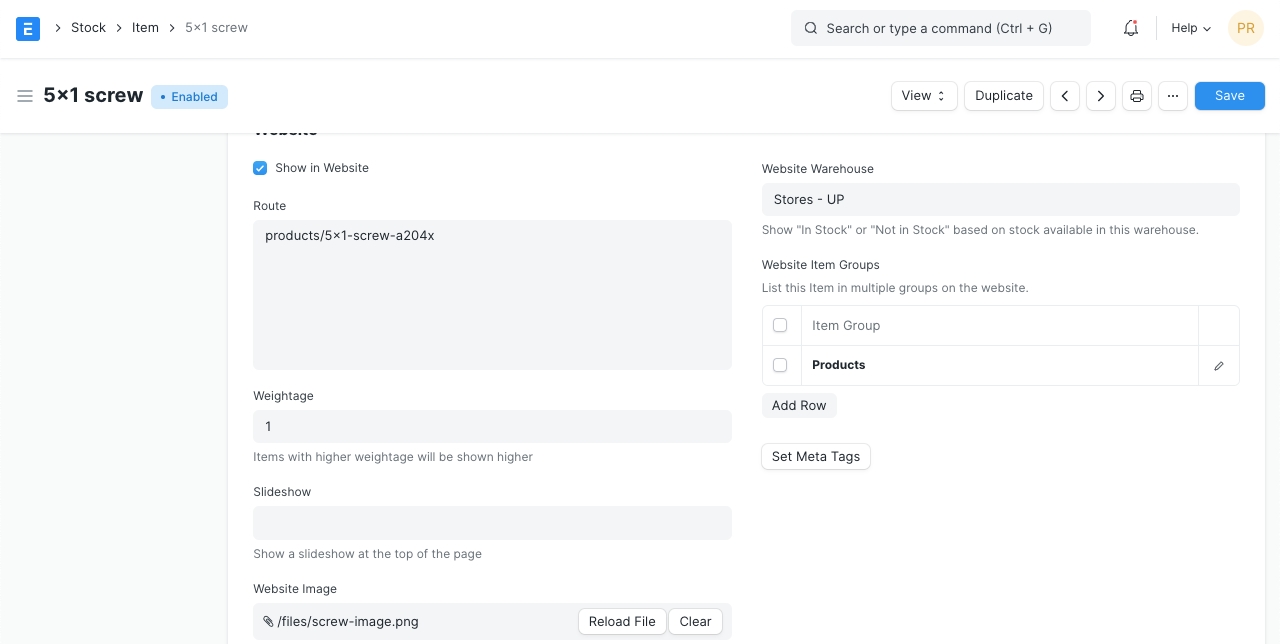 Show in Website: Choose if you want to show this Item on your website. Once you tick this, additional options will be visible to configure the item on your website. To view the item on the website click on the 'See on Website' link on the top left just above the item image. Visit the Website module to know more.