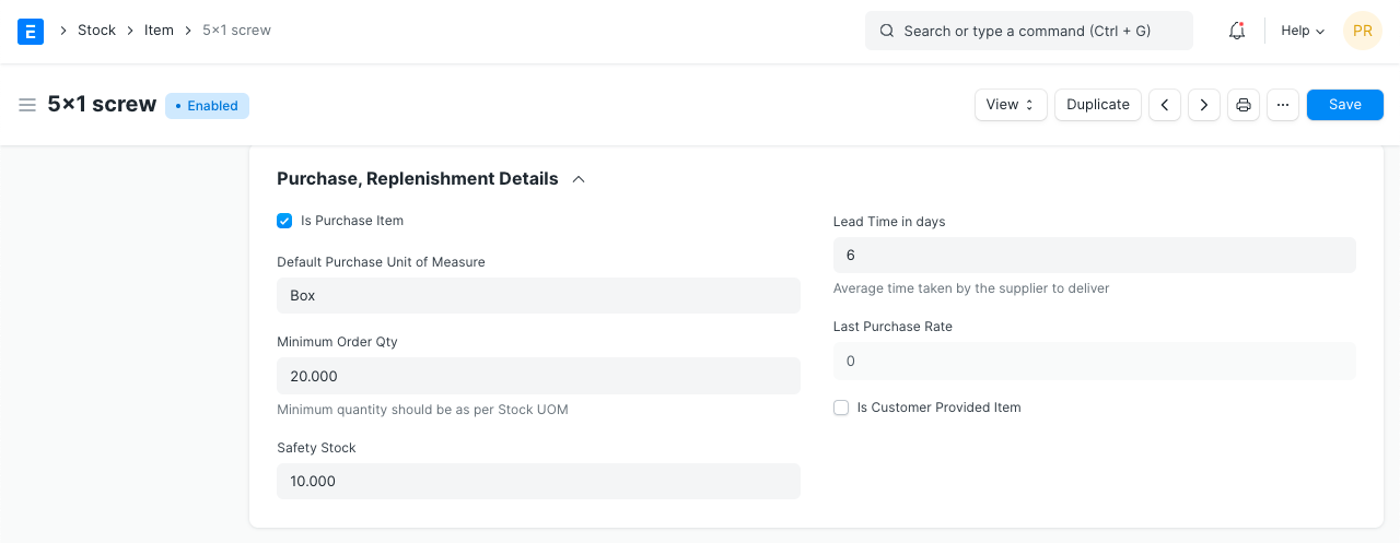 Safety Stock: “Safety Stock” is used in the report “Itemwise Recommended Reorder Level”. Based on Safety Stock, average daily consumption and the lead time, the system suggests Reorder Level of an item.
