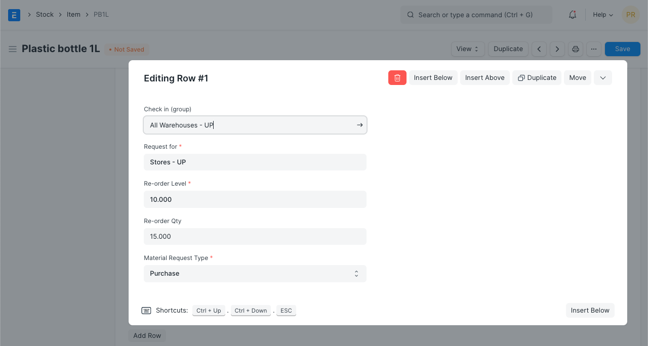 Material Request Type: The Material Request type with which the stock will be reordered. This depends whether you buy the Item, manufacture it yourself or transfer it between Warehouses.