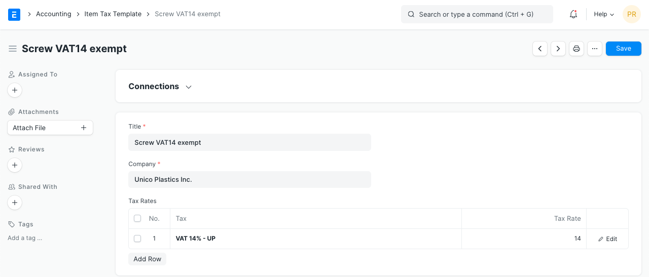 You need to create a new 'Item Tax Template' or choose an existing one. For example, if you have a tax Account, “VAT 14%” and this particular Item is exempted from tax, then you select “VAT 14%” in the first column, and set “0” as the tax rate in the second column. Visit the Item Tax Template page for more details.