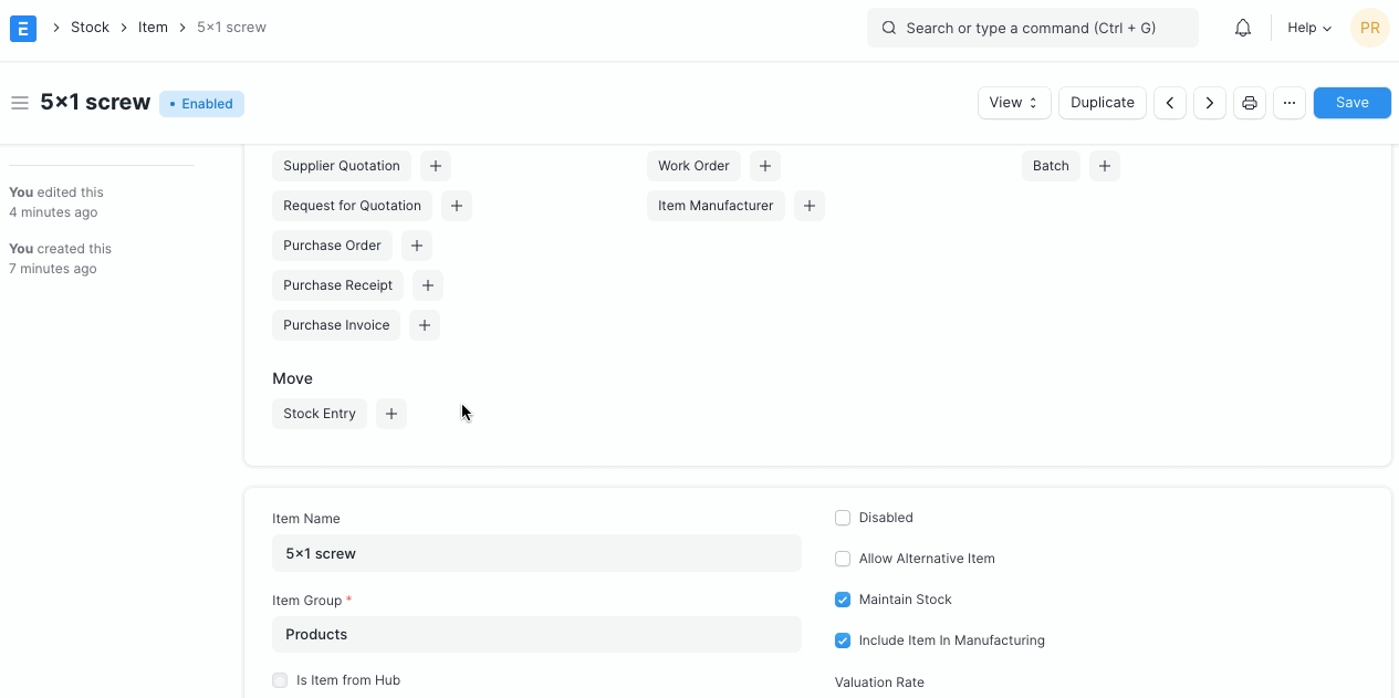 > Note: Once you mark an item as serialized or batched or neither, you cannot change it after you have made a Stock Entry.