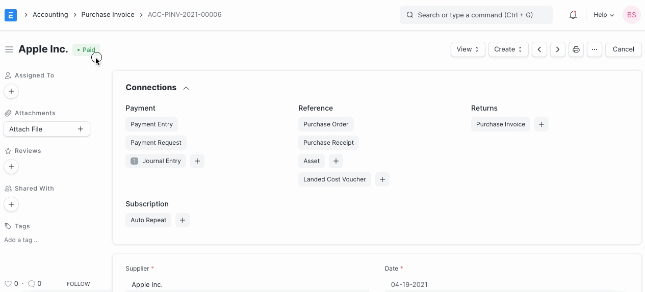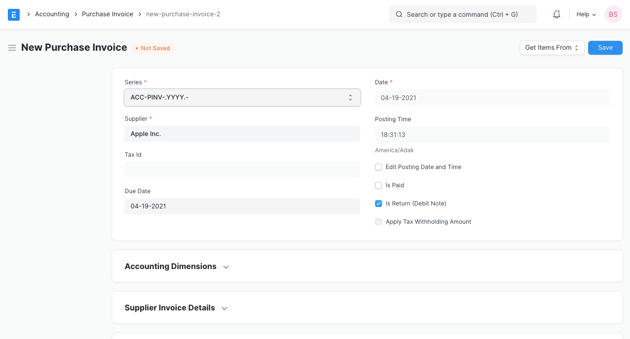 The Supplier and Item details will be fetched as set in the Purchase Invoice.