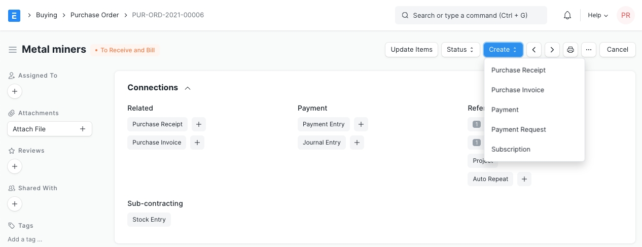 Create: From a submitted Purchase Order, you can create the following:
