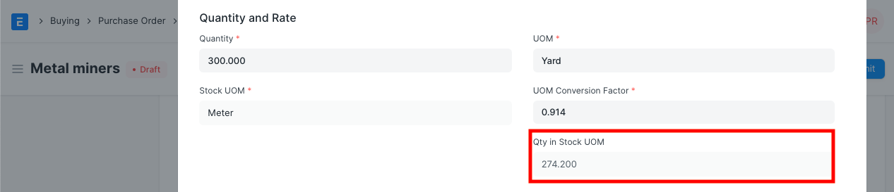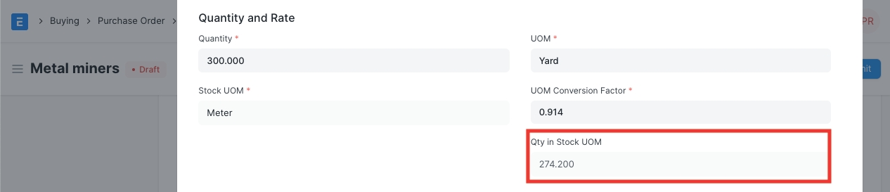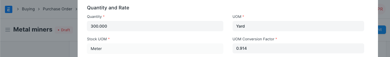 Quantity and Rate: When you select the Item code, it's name, description, and UOM will be fetched. The 'UOM Conversion Factor' is set to 1 by default, you can change it depending on the UOM received from the seller, more in the next section.