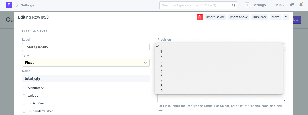 In Howinibs, default precision for Float, Currency and Percent field is three. It allows you to enter value having value upto three decimal places.
