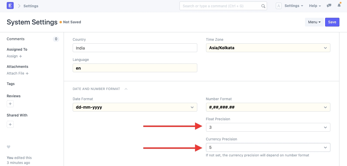Alternatively, you can also set field specific precision. To do that go to Customize Form and select the DocType there. Then go to the specific field row and change precision. Precision field is only visible if field-type is one of the Float, Currency and Percent.