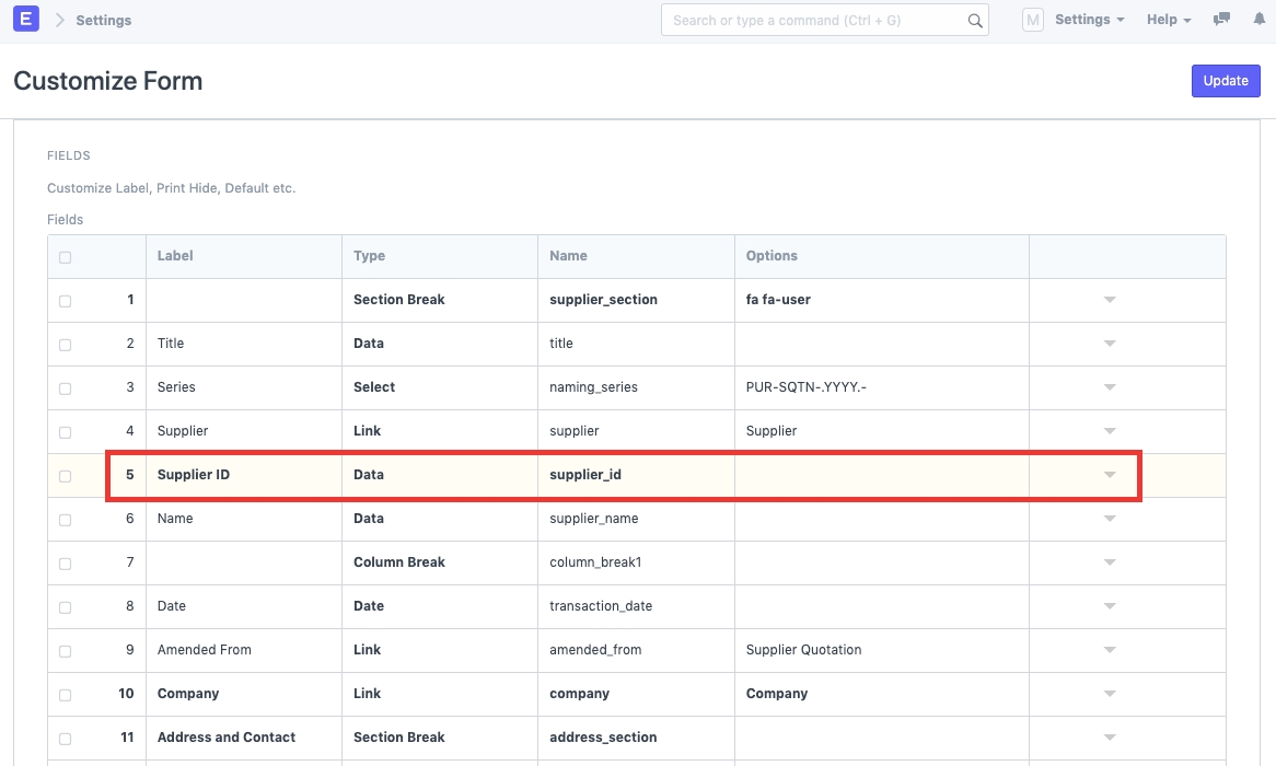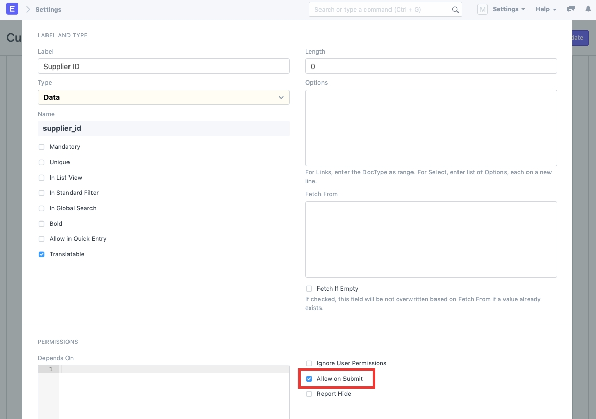 However, you can still make certain fields (custom fields) editable after submission using the Allow on Submit feature. For example, we have created a custom field called "Supplier ID" in Supplier Quotation. To allow editing of this field after submission, follow the following steps: 1) Go to Settings > Customize Form and select the Form Type (Supplier Quotation in this case). 2) Expand the field row and check the "Allow on Submit" checkbox.