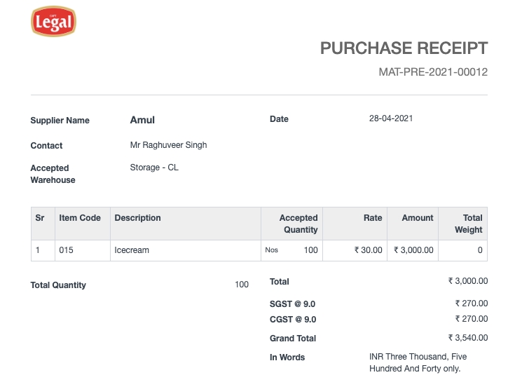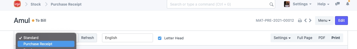 Refresh your screen and select the newly created Print Format. In this case, it is the 'Purchase Receipt'.