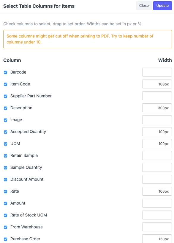 Once you have selected the columns you want your Print Format to have, click on 'Update' and 'Save' the changes you have made after further modifications in the Print format.