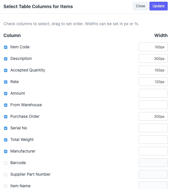 Select the columns you want to keep in the Table that you are creating for your customized Print Format. You can adjust the Width and their order according to your requirement.
