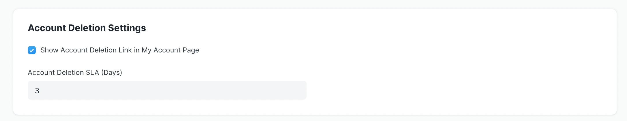In the Account Deletion SLA (Days) field set the number of days within which users request for Account Deletion will be fulfilled.