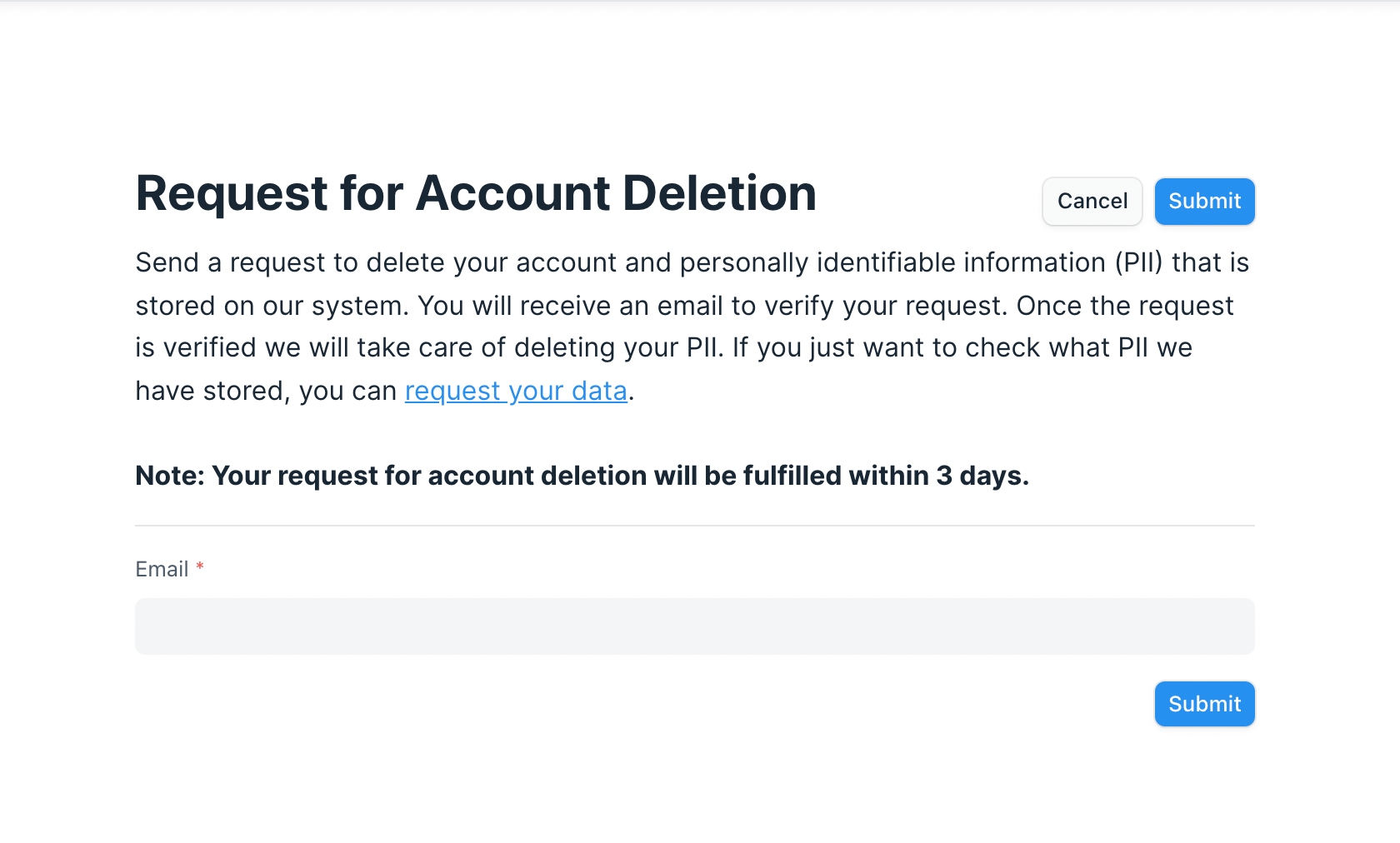 Deletion Request Success This will send an email with a verification link to delete data to the email address associated with the user.