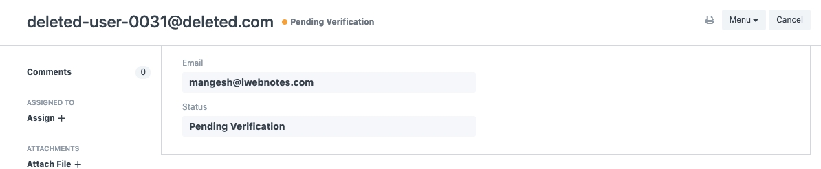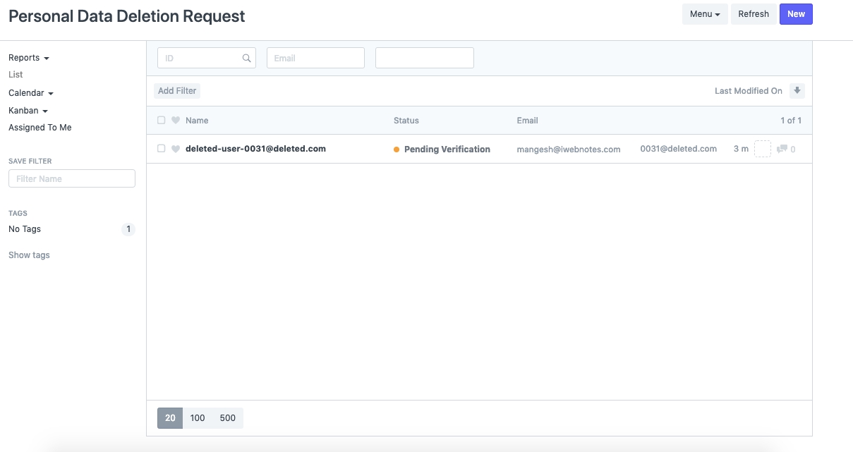This status indicates that the user has requested data deletion via the web-form. However, verification of this request is still pending. Search for Personal Data Deletion Request from the search bar.