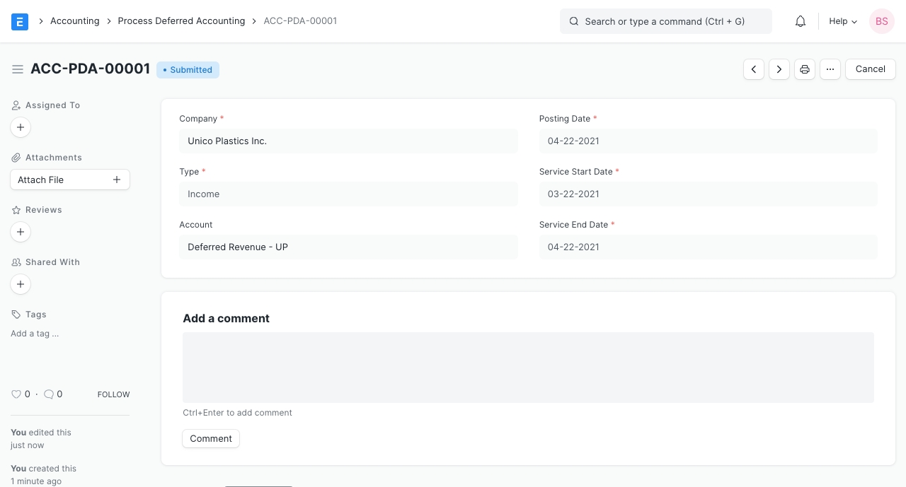 On submitting a Process Deferred Accounting document, GL Entries for deferred revenue or expense booking will be created for all the invoices falling between the service Start Date and End Date.