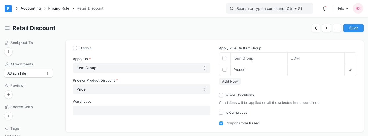 b) Give discount (based on Pricing Rule) on overall purchase i.e. Coupon codeTo access the Coupon Code list, go to: