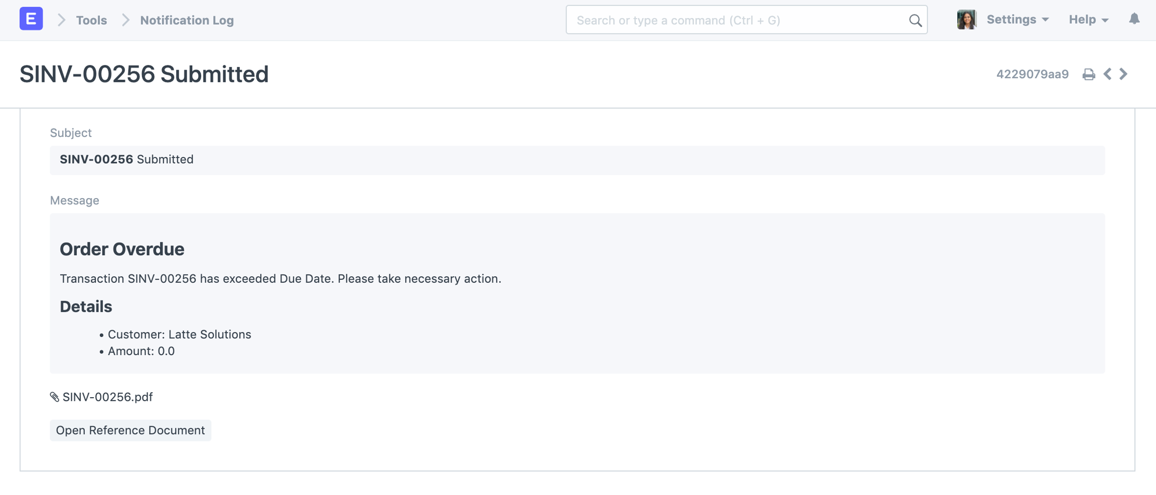 Clicking on the notification routes to the Notification Log document which contains the configured subject, message as well as the attached file, if Attach Print is set: