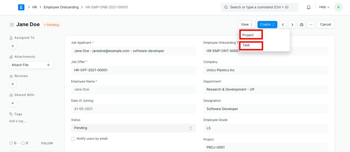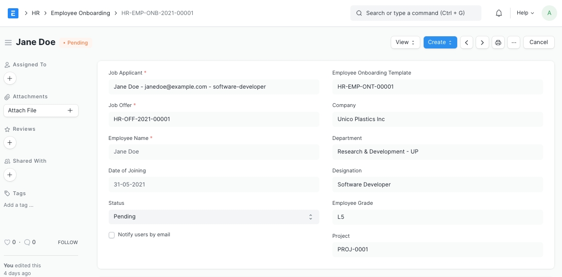 The Employee Onboarding Template is a blueprint which contains a predefined list of Activities for Employee Onboarding. An Employee Onboarding Template can be created for a particular Department, Designation and Employee Grade.