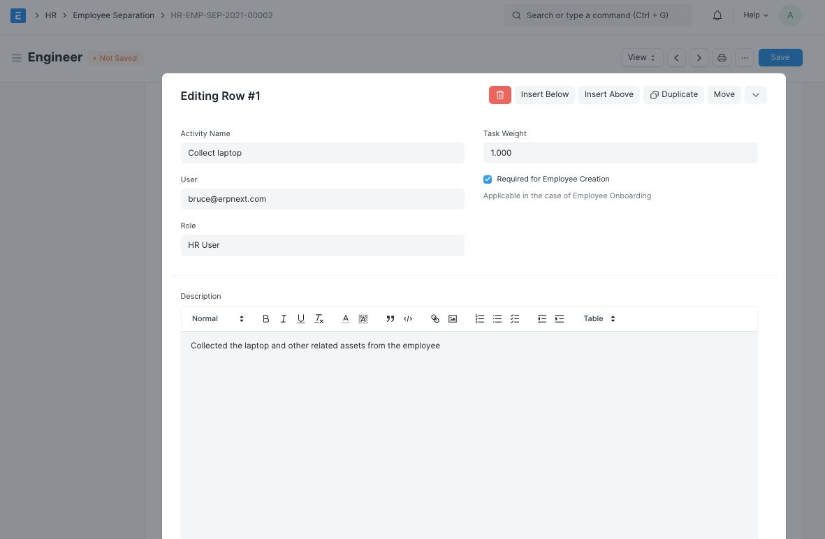 Mention the Activities for separation. For each Activity, you can also mention the User or Role, or one of it, to whom this Activity will be assigned.
