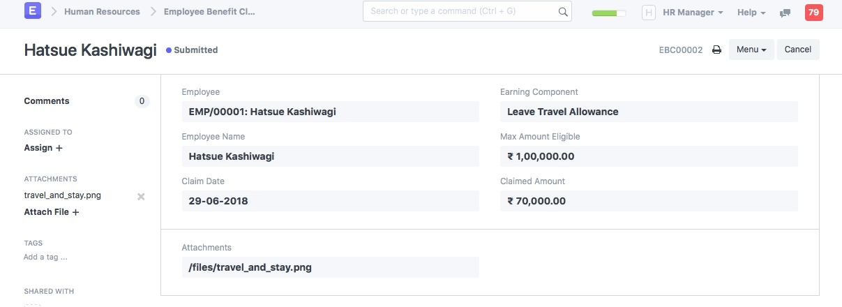 You can create a new Employee Benefit Claim by going to, > Human Resources > Payroll > Employee Benefit Claim > New Employee Benefit Claim