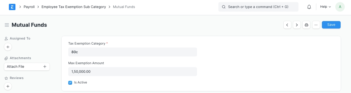You can configure Employee Tax Exemption Category by going to, Employee Tax and Benefits > Employee Tax Exemption Sub-Category